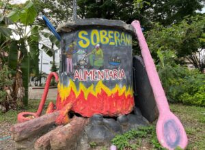 La escultura de la olla comunitaria honra uno de los actos más poderosos y silenciosos del Paro: el alimentar al otro. Mujeres de distintos barrios se organizaban para cocinar en las calles, brindándoles comida a todas las personas que luchaban como forma de apoyo a la resistencia.