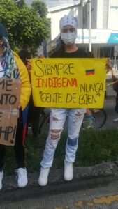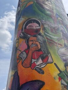 Yo tenía una olla grande de sancocho para atender y darles alimentación a aquellos que luchaban por nuestros derechos cuando los gases empezaban a arder en los ojos. Las noches eran largas. El sonido de los helicópteros nos mantenía despiertas, y la rabia se mezclaba con el cansancio. Pero también había esperanza. Recuerdo que las mujeres no solo luchaban por medio de la fuerza o los gritos de lucha que se percibían en el ambiente, sino que también luchaban por medio del arte.