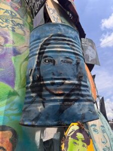Un tarro metálico convertido en escudo lleva pintado el rostro de una mujer. Esta intervención artística refleja cómo, en medio de la confrontación, se transformaron objetos cotidianos en símbolos de defensa.