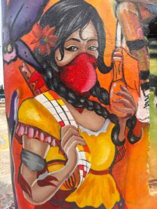 La pintura muestra el rostro de una mujer con rasgos indígenas, tapabocas y mirada firme. Surgió de los colectivos de mujeres artistas que usaron el muralismo como herramienta de resistencia. A través del color y la imagen, estas creadoras denunciaron la violencia, defendieron la vida y reivindicaron la identidad femenina en la protesta.